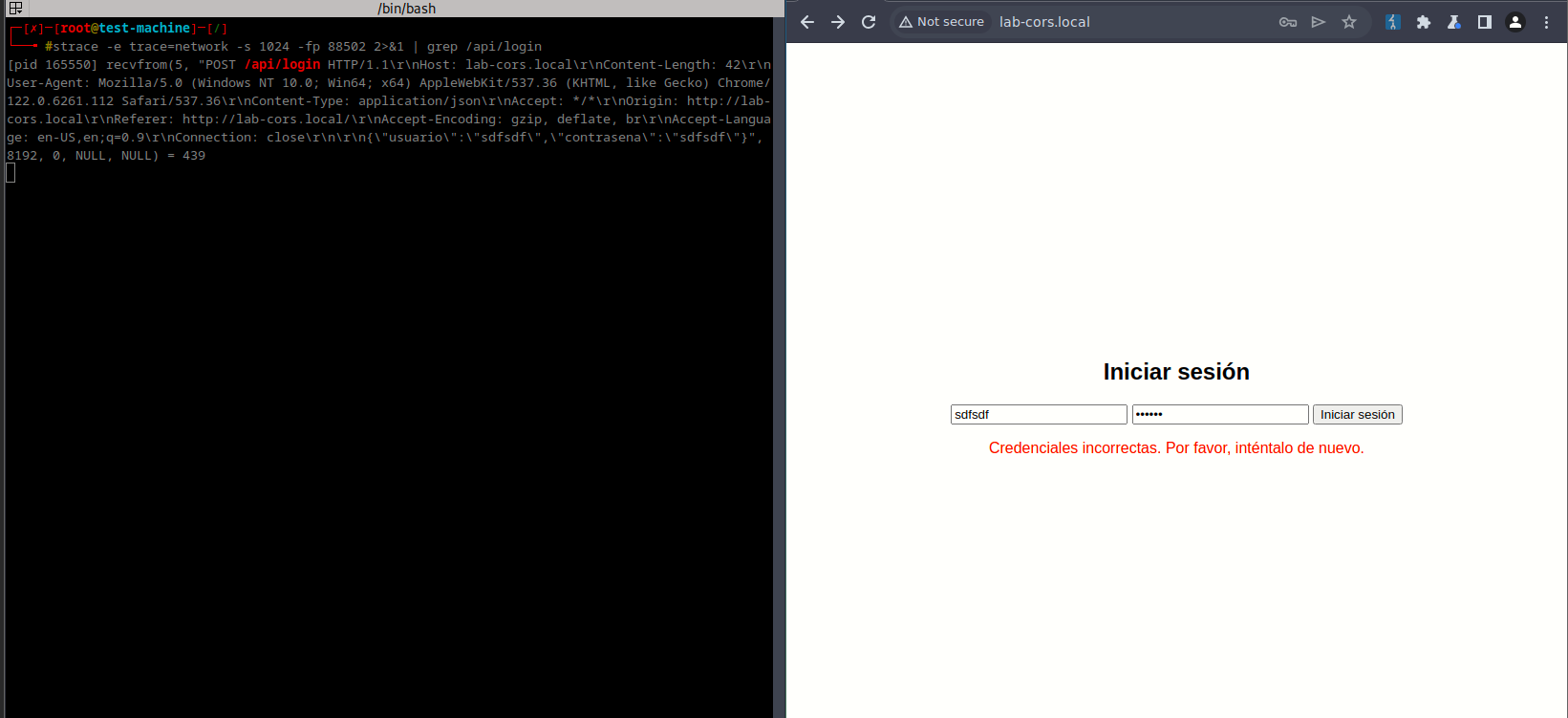 [pid 165519] recvfrom(5, "POST /api/login HTTP/1.1\r\nHost: lab-cors.local\r\nContent-Length: 42\r\nUser-Agent: Mozilla/5.0 (Windows NT 10.0; Win64; x64) AppleWebKit/537.36 (KHTML, like Gecko) Chrome/122.0.6261.112 Safari/537.36\r\nContent-Type: application/json\r\nAccept: */*\r\nOrigin: http://lab-cors.local\r\nReferer: http://lab-cors.local/\r\nAccept-Encoding: gzip, deflate, br\r\nAccept-Language: en-US,en;q=0.9\r\nConnection: close\r\n\r\n{\"usuario\":\"sdfsdf\",\"contrasena\":\"sdfsdf\"}", 8192, 0, NULL, NULL) = 439